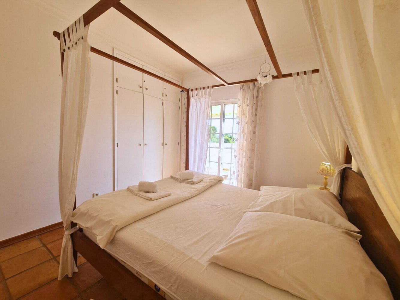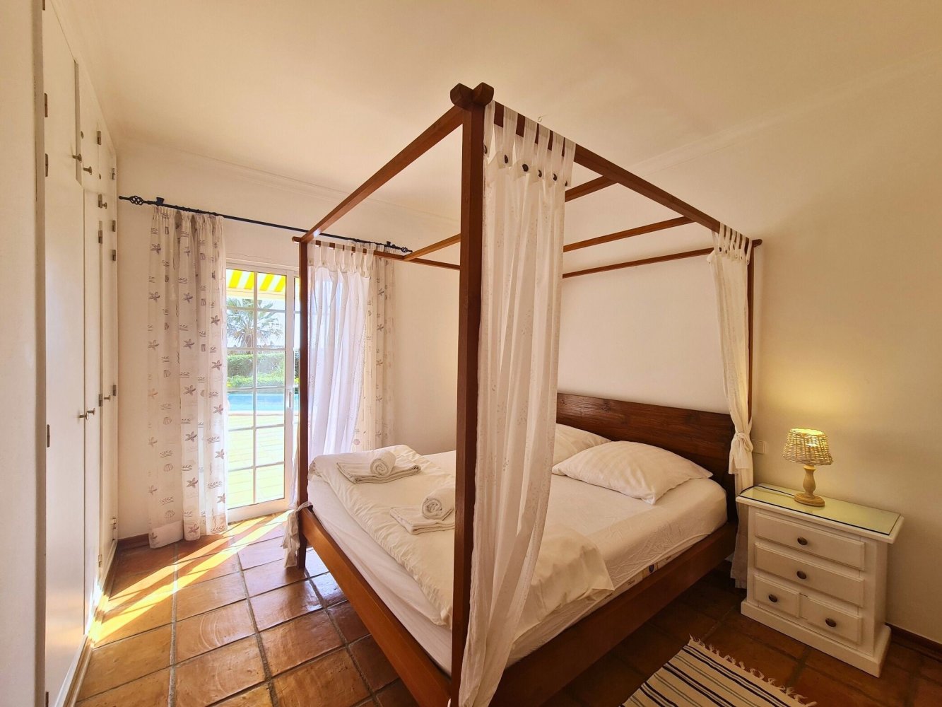 Die Villa bietet drei komfortable Schlafzimmer mit direktem Zugang zur Terrasse und zum Pool. Das Hauptschlafzimmer verfügt über ein eigenes Bad en suite mit Badewanne und Dusche. Zwei weitere Schlafzimmer teilen sich ein modernes Badezimmer mit Dusche. Zwei Zimmer sind mit Doppelbetten ausgestattet, das dritte Zimmer verfügt über ein komfortables Einzelbett mit ausziehbarem Gästebett.