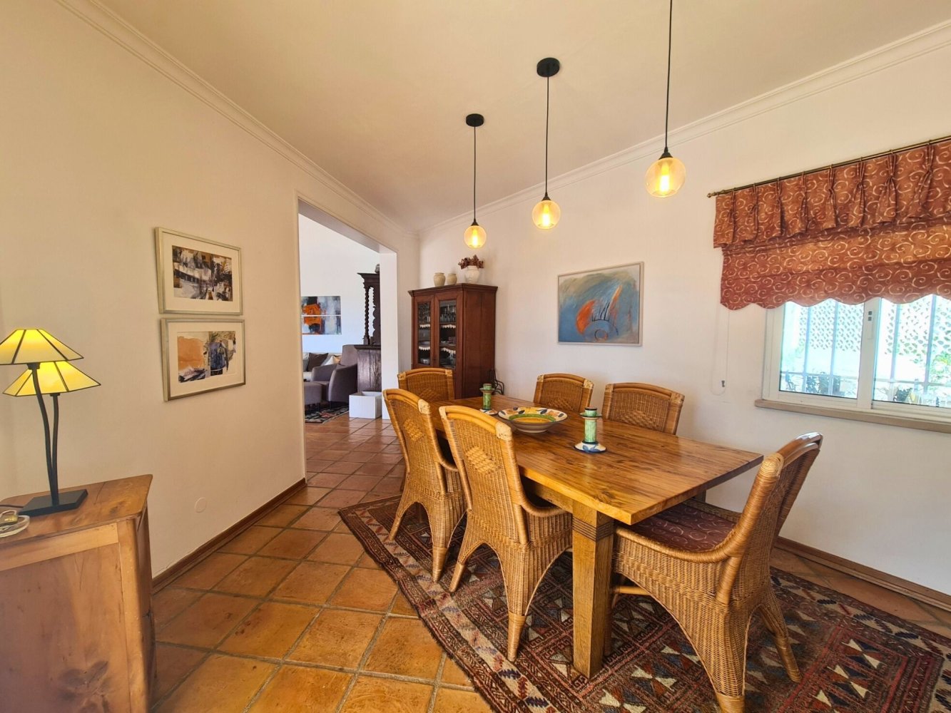 Die komfortable Villa mit Pool verbindet mediterranen Charme mit moderner Ausstattung. Der großzügige Wohn- und Essbereich mit Smart-TV, DVD-Player und JBL Smart Home Lautsprecher bietet direkten Zugang zur sonnigen Terrasse und zum Poolbereich mit Meerblick.