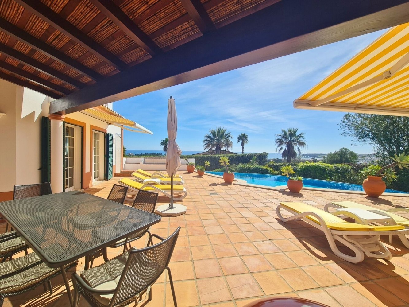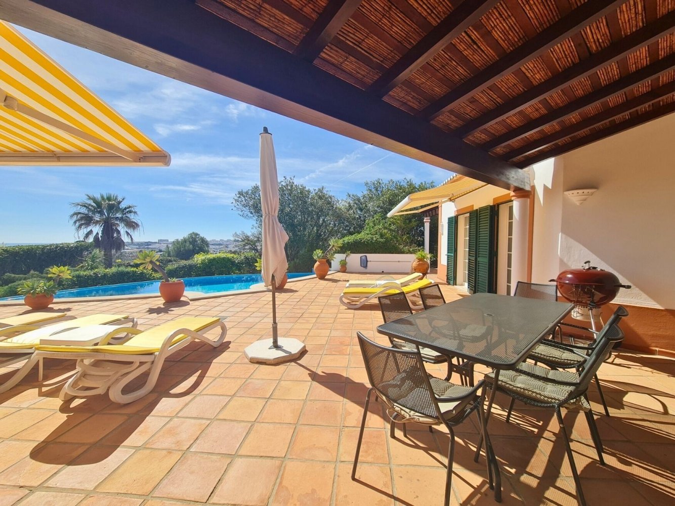 Ein besonderes Highlight ist die nach Süden ausgerichtete Sonnenterrasse mit Terrakotta-Fliesen und teilweiser Beschattung durch Markisen. Der großzügige Kaskaden-Pool (10,5 × 5 m) lädt zum Entspannen ein, während Gartenmöbel und Sonnenliegen perfekte Bedingungen für einen erholsamen Urlaub an der Algarve bieten.