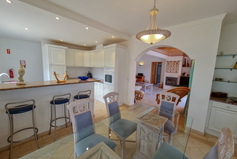 Die Villa besteht aus einem Wohnzimmer mit Kamin, offen zum gemütlichen Essbereich und zur voll ausgestatteten Küche mit Herd, Backofen, Kühlschrank und Geschirrspüler. 2 einladende Schlafzimmer mit Doppelbetten, 1 Schlafzimmer mit Einzelbett und einem als Bett ausklappbarer Sessel (0,80 x 1,90 m), geeignet für ein Kind. 2 Bäder, eins davon en suite. Die Villa ist u. a. ausgestattet mit Mikrowelle, Waschmaschine, SAT TV (Astra), HiFi Anlage mit CD Player und kostenfreies WLAN, so dass die Feriengäste ihren Aufenthalt in komfortabler Atmosphäre genießen können. Eine Gaszentralheizung für die kälteren Monate ist vorhanden. Vor der überdachten Terrasse liegt der 9x5m große kristallklare Pool mit BBQ, Sonnenliegen und Gartenmöbeln. Im ersten Stock befindet sich eine geschlossene Aussichtsgalerie mit Blick auf das Meer.